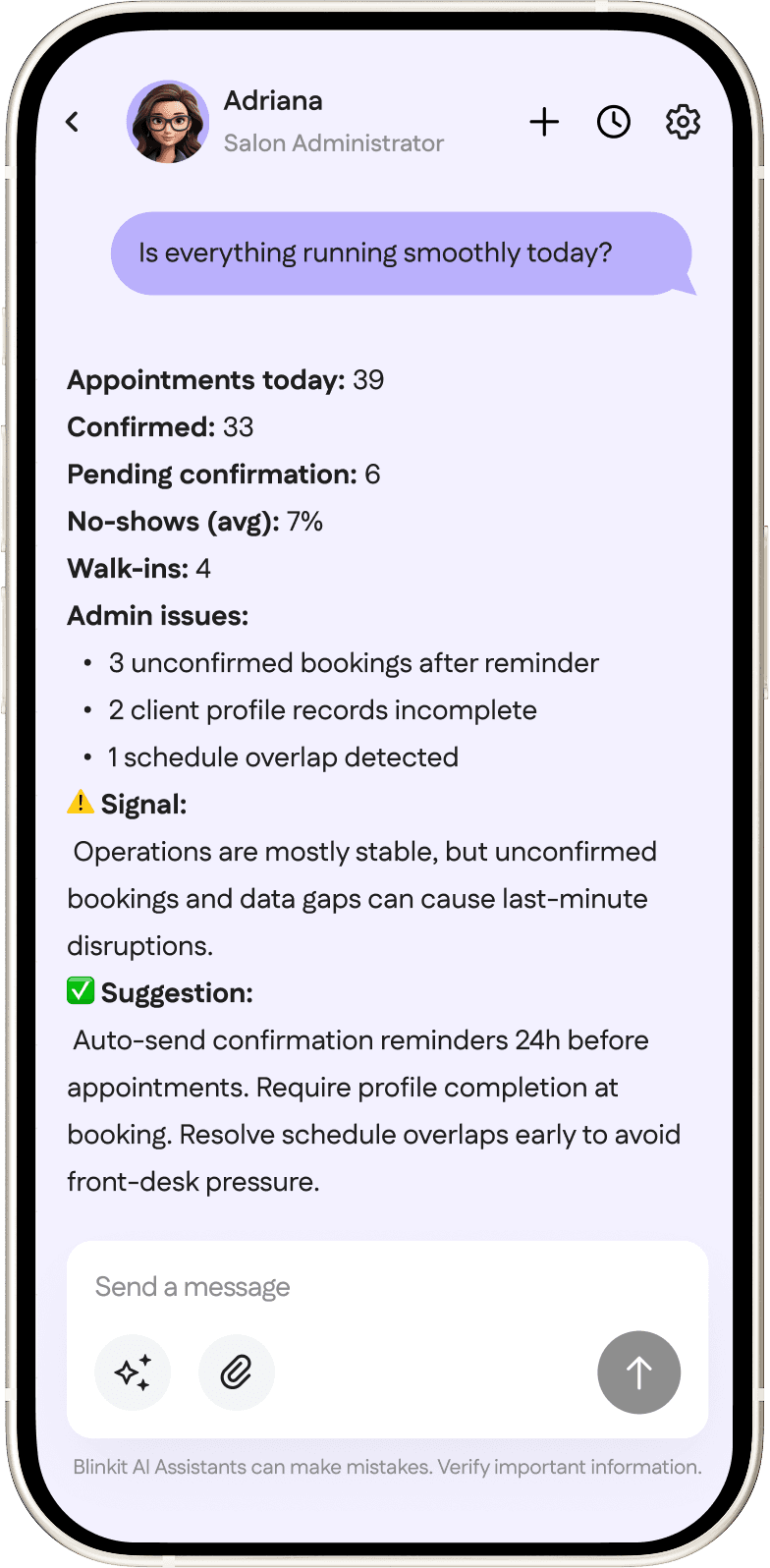 AI agents work on top of your salon’s real data — bookings, services, prices, team, and performance. They analyze how your salon operates and provide relevant insights and suggestions without needing constant input.